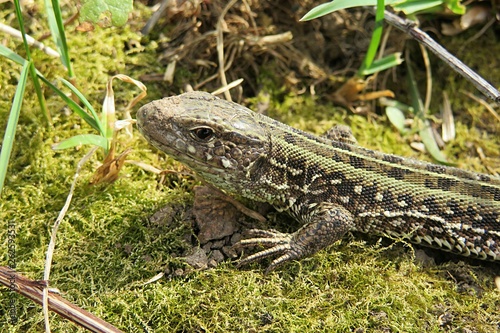 © natalya2015, Naklejka premium European lizard on grass in the garden, closeup