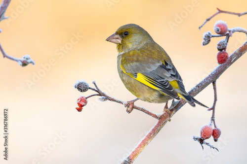 Obraz premium European male goldfinch (chloris chloris), sitting on a branch on a...