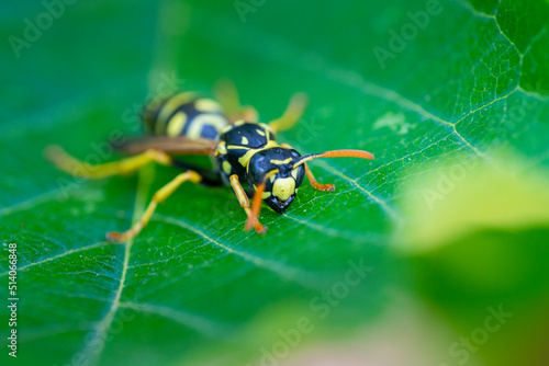 Fototapeta premium European paper wasp or Polistes dominula on green leaf