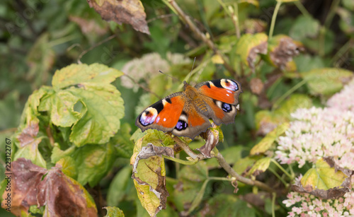 Fototapeta premium European Peacock butterfly sitting on a dry vine leaf in autumnal garden