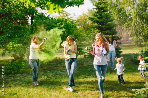 © davit85, Fototapeta premium European people celebrate Indian holi festival with colorful pai