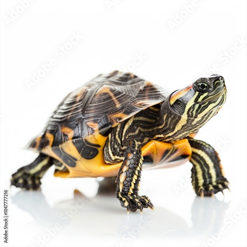 Fototapeta premium European Pond Turtle with striking dark shell is showcased against a pristine white background creating a vivid contrast that highlights its unique features and patterns.