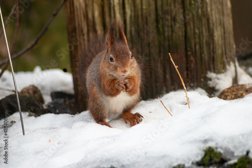 © Margit Kluthke, Fototapeta premium European red squirrel collects sunflower seeds in the snow