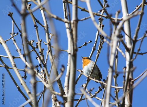 © Anna, Fototapeta premium European Robin (erithacus rubecula) perching in a tree and singing, seen against a blue sky. Early spring, and the branches are still bare.