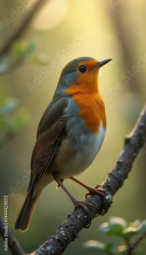 Fototapeta premium European Robin Perched on a Branch in Soft Sunlight, Detailed Plumage and...