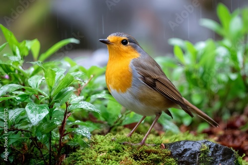 © kardaska, Fototapeta premium European robin perching on moss during rain