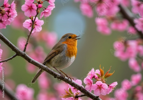 Fototapeta premium European Robin Singing Amidst Pink Cherry Blossoms