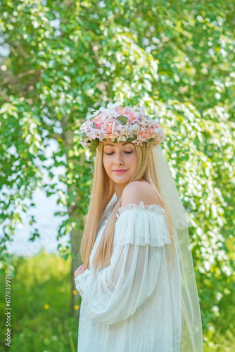 Fototapeta premium European Slavic Tradition, bride woman in white dress, flower wreath with a veil on a head. Tender girl