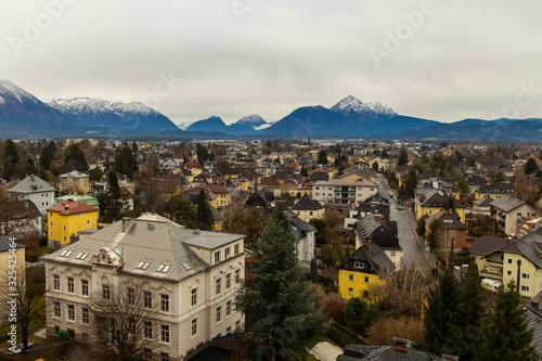 © Artem Kniaz, Obraz premium European small city rustic landmark view from above depression gray colors in autumn season time weather city streets and houses roof with mountain ridge landscape background scenery