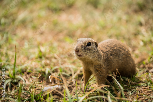 Naklejka premium European susliks in the meadow. Ground squirrel in wild nature.