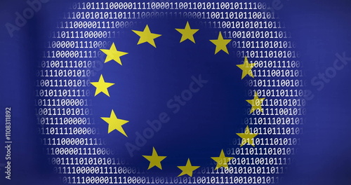 © vectorfusionart, Naklejka premium European Union flag with binary code image surrounding it