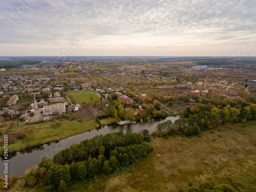 Naklejka premium European village, river, forest. Aerial view.