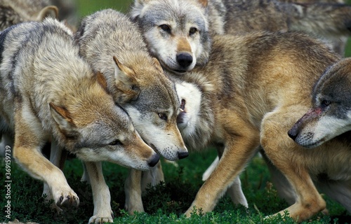 Fototapeta premium EUROPEAN WOLF canis lupus, GROUP SHOWING DOMINANCE AND SUBMISSION