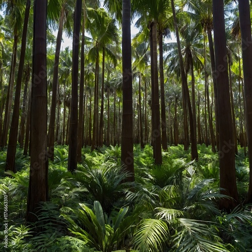 © KAThakshala, Fototapeta premium Euterpe Edulis Forest: A Panoramic View of Palms, Light, and Shadows in the Dense Jungle