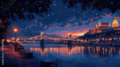 Obraz premium Evening cityscape by the river, starry sky