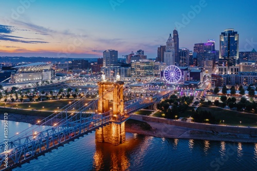 Fototapeta premium Evening cityscape view of the Cincinnati skyline, featuring the iconic Roebling Suspension Bridge at twilight. Downtown, Cincinnati, Ohio, United States