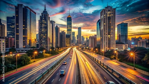 © PhotoPhreak, Fototapeta premium Evening Cityscape with Light Traffic Flow on Modern Highway