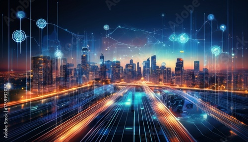 © Kathleen, Obraz premium evening cityscape with smart grid technology in action