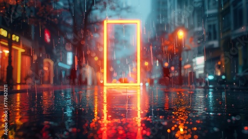 © deafebrisa, Fototapeta premium Evening drizzle in a cityscape, surrounded by the ambient light of a neon rectangle