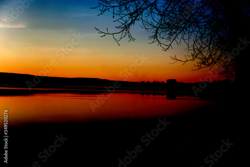 © indigolotos, Obraz premium Evening dusk over the lake at sunset.