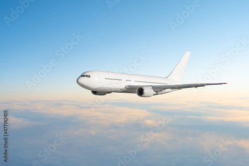 © aapsky, Fototapeta premium Evening flight flying plane in the sky before sunset.