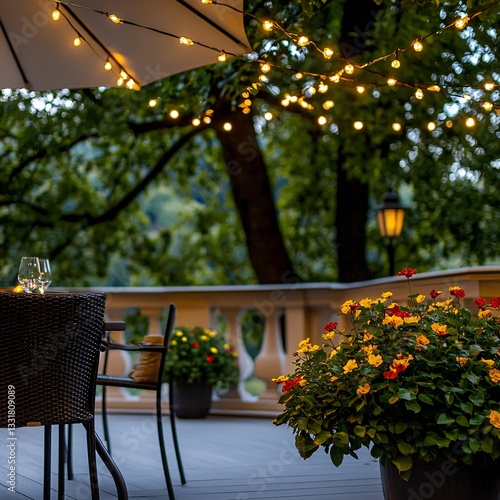© Plake, Obraz premium Evening garden patio dining, lights, flowers. Website, blog use