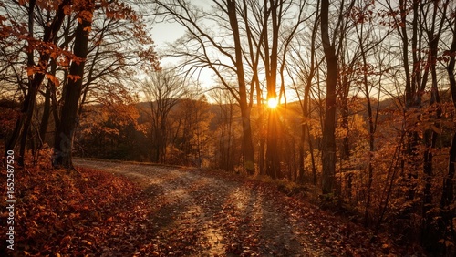 Fototapeta premium Evening glow over a woodland in fall with scattered leaves and winding path