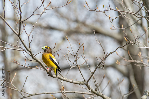 © Roxane Bay, Fototapeta premium Evening Grosbeak perched on a branch landscape