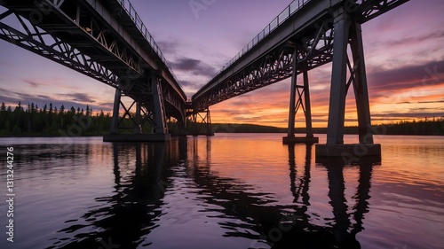 © Chamika, Fototapeta premium Evening Harmony: A Steel Bridge Enveloped in Quebec’s Twilight