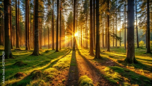 © Sayfar, Obraz premium Evening in the forest with warm golden light casting long shadows across the forest floor and trees, evening, sunset, undergrowth, golden hour