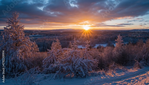 Naklejka premium Evening landscape illuminated by sunlight, showcasing seasonal change