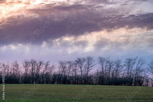 © Aleksandr Riabinin, Fototapeta premium Evening landscape on the green field with wheat.Landscape at the sunset , clouds with red and purple colors , beautiful sun and sunset.Trees and forest near the field