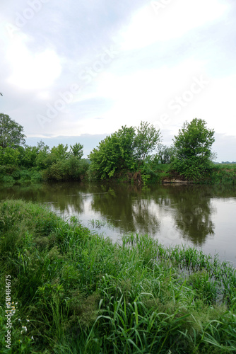 Fototapeta premium Evening landscape with the last rays of the sun. Morning by the river in summer. Beautiful nature, photo for design