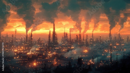 © Pannin, Fototapeta premium Evening light over an oil refinery with glowing lights and vapor rising from chimneys.
