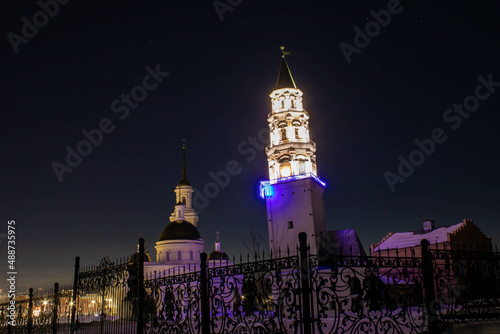 Fototapeta premium Evening Nevyansk, Sverdlovsk region, Ural, Russia. February, 2022 Вечерний Невьянск, Свердловская область, Урал, Россия. Февраль, 2022 год.