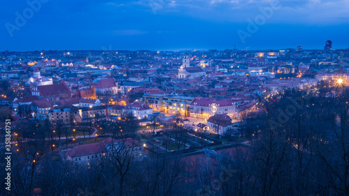Obraz premium Evening panorama of Vilnius city in Lithuania with night illumination. Top View.