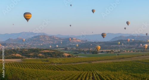 © AkuAku, Naklejka premium Evening panorama with hot air balloons above thriving vineyards