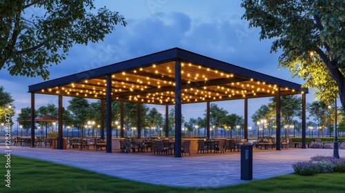 Fototapeta premium Evening Park Pavilion With String Lights And Seating