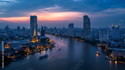 Fototapeta premium Evening river cruise bangkok cityscape urban panoramic serenity under twilight sky
