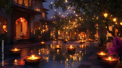 Naklejka premium Evening scene depicting a courtyard illuminated by candlelight and hanging lights