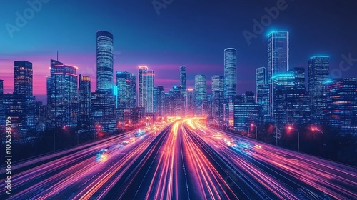 Fototapeta premium evening scene of a city highway with modern skyscrapers and light traffic,...