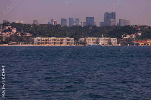 © Tatiana, Fototapeta premium Evening sea view off the coast of Istanbul. Orange sunset sky