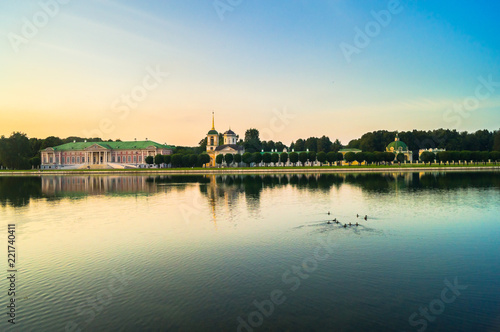 Naklejka premium Evening serenity of the palace pond, included into ensemble of the State reserve museum Kuskovo, former aristocratic summer country estate of the russian nobility of the 18th century. Moscow. Russia.