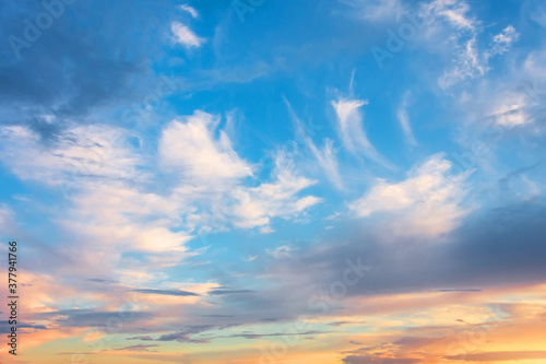 Fototapeta premium Evening sky frame with cirrus clouds at sunset.