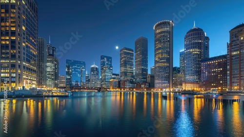 Obraz premium Evening skyline view of a major financial district like Chicago or Boston,...