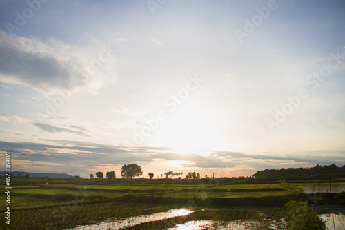 © Montree, Fototapeta premium Evening sun light on wide field in the farming season