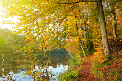 © Swetlana Wall, Fototapeta premium Evening sunlight at lake and autumn trees.