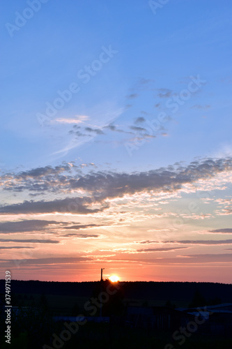 © Lushchikov Valeriy, Fototapeta premium Evening sunset landscape orange clouds and a trace of the plane