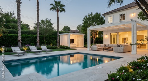 © Phan, Fototapeta premium Evening Tranquility: Backyard Pool and Patio Oasis AI Generated