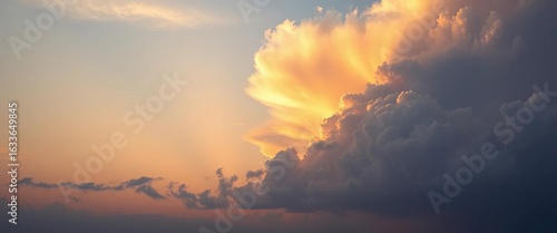 Fototapeta premium Evening twilight sky, soft orange-gold clouds, sunlight, blue backdrop,...